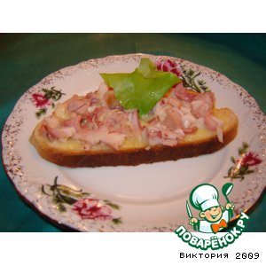 чесноком (у меня оставалось от закуски с помидорами), намазать смесь на батон, и посыпать мелко нарезанной копченой курочкой (осталось от салата). В микроволновку на 30 -60 секунд. Вкусно!