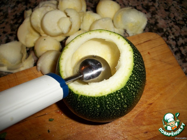 Пока жарится лук, вытащим мякоть из наших кабачков. Я обычно пользуюсь вот такой специальной ложечкой, при помощи которой можно очень легко и ровненько избавиться от мякоти.