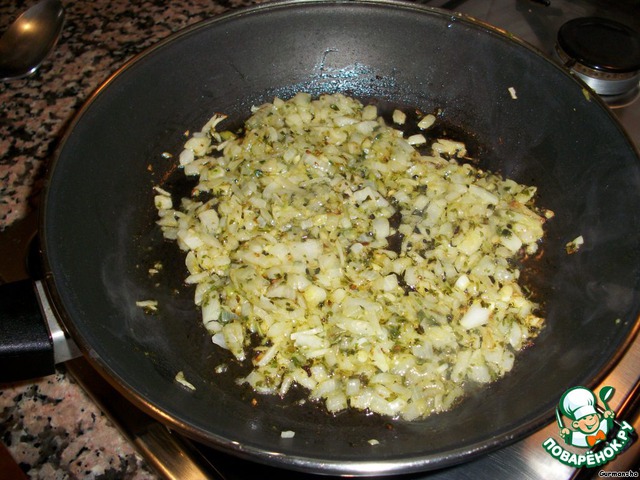 Приготовим начинку. Почистим и нашинкуем луковицу, спассируем ее на растительном масле (я использовала оливковое) почти до готовности с мелко порезанным чесноком.