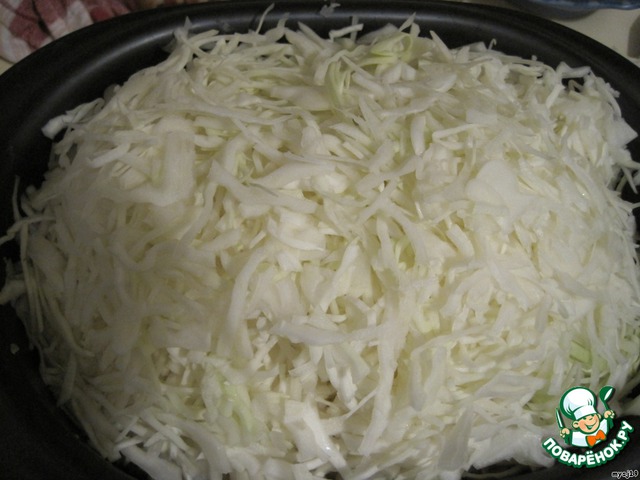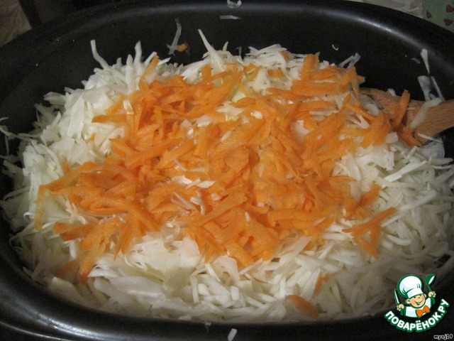 Добавляем к луку нашинкованную соломкой капусту. Можно ее «пожумкать» с солью, чтобы дала сок – предпочитаю этого не делать.