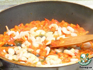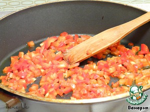 На оливковом масле слегка обжарить мелконарезанный болгарский перец и перец чили.
