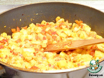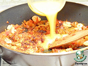Непрерывно помешивая, влить сырое яйцо, добавить карри, паприку и кусочки нарезанного ананаса.