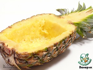 Небольшой ананас разрезать вдоль на половинки. Аккуратно извлечь мякоть.