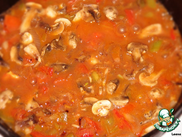 На той же сковородке, где обжаривалась курица, обжарить до легкого румянца сначала лук и чеснок, добавить перец, затем помидоры и грибы. Посолить, налить вино, протушить все вместе минут 10. -