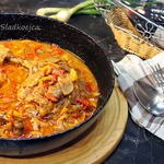 Хотя я поступила чуть иначе. Накануне мама отдала мне свою старую, еще советскую, утятницу, чугунную, эмалированную, тяжеленную. Ей лет наверное столько же, сколько и мне. Очень нетерпелось ее опробовать, поэтому я сложила овощи и курочку в утятницу, накрыла крышкой и поставила в духовку при 200*С минут 20-30.