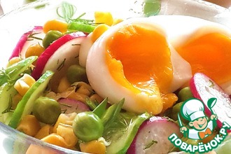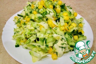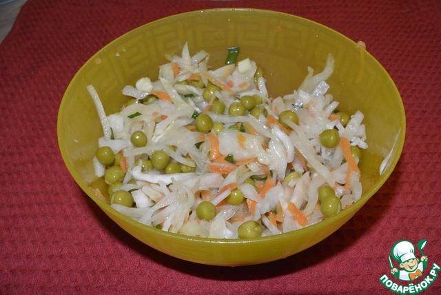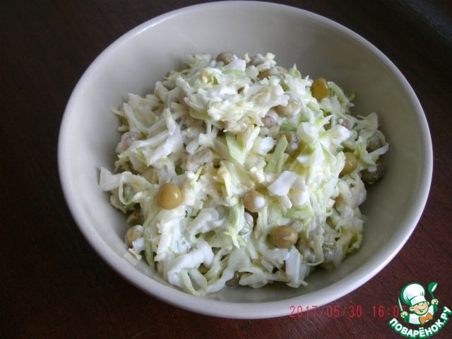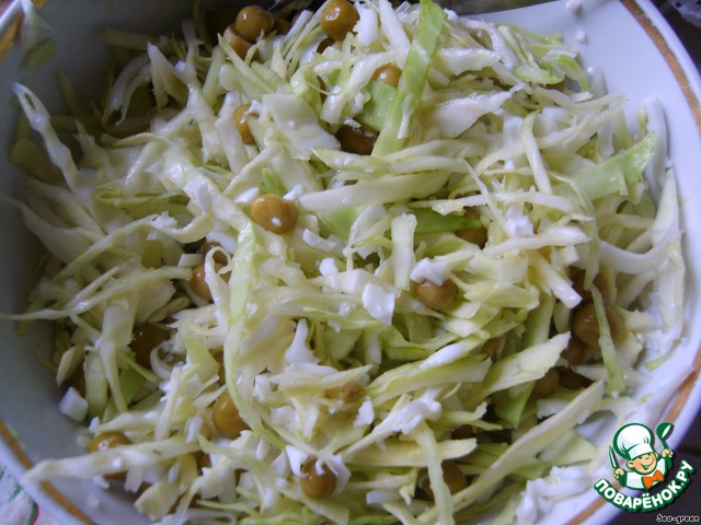 Легкий салатик из капусты, яйца и горошка.