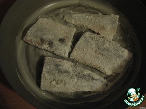 Сельдь очистить, разделить на порционные кусочки, хорошо вымочить.