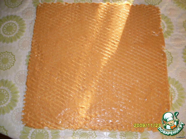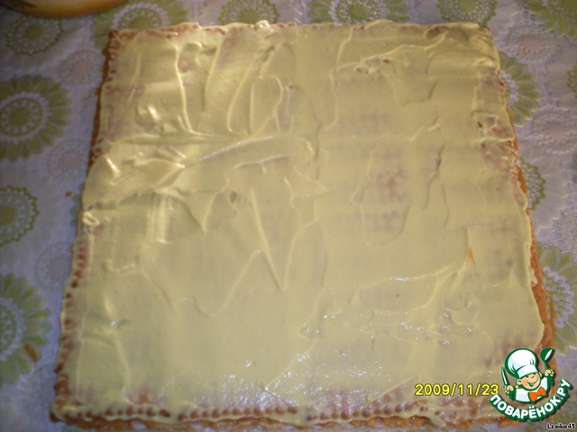 Начинаем собирать торт. Вафельный корж смазываем кремом из сгущенки.