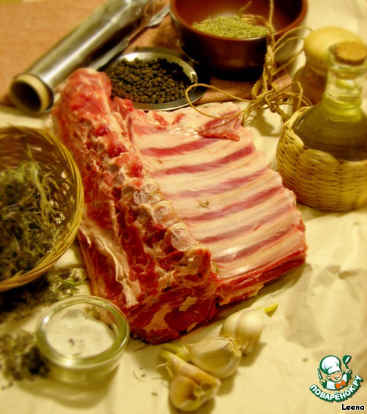 Пласт мяса сворачиваем рулетиком, ребрышки формируем в "корону", туго перевязав жгутом. Косточки нужно обернуть фольгой, чтобы не горели.
