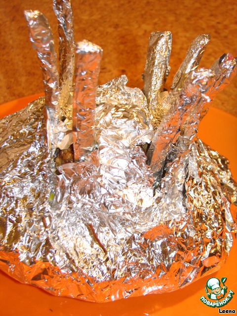 А затем и весь кусок мяса оборачиваем фольгой, помещаем в сковородку и отправляем в наш "очаг" минут на 60 при 180*С.