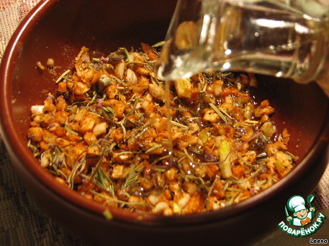 Мелко измельчаем чеснок, добавляем соль, молотый перец, листики чабреца, розмарина - все перемешиваем и вливаем оливковое масло.
