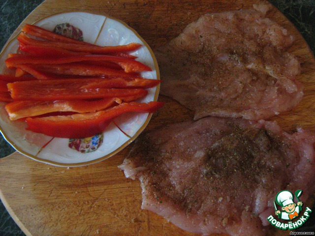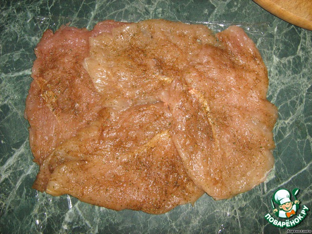 Филе отбиваем только с одной стороны- внутренней. У меня получилось 4 отбивных. Солим, добовляем специ.