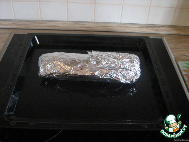 • На фольгу кладём рулет шовчиком вниз (тогда он не раскроется), и заварачиваем. Выкладываем на протвинь, куда наливаем стакан воды и в духовой шкаф на 50 мин. 180 град.