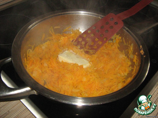 • Режем кубиками лук. Трём морковь. Жарим овощи. Солим.