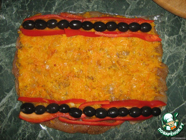 • Тушённые овощи (морковь и лук) выкладываем по всей поверхности филе. Резаный перчик выкладываем дорожкой для маслин, с двух сторон рулета. Маслиные дорожки зпсыпаем желатином.