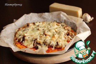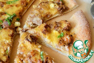 Разложить всю начинку на пиццу, посыпать сыром, сбрызнуть оставшимся растительным маслом. Поставить в разогретую до 200 градусов духовку на 20 минут.