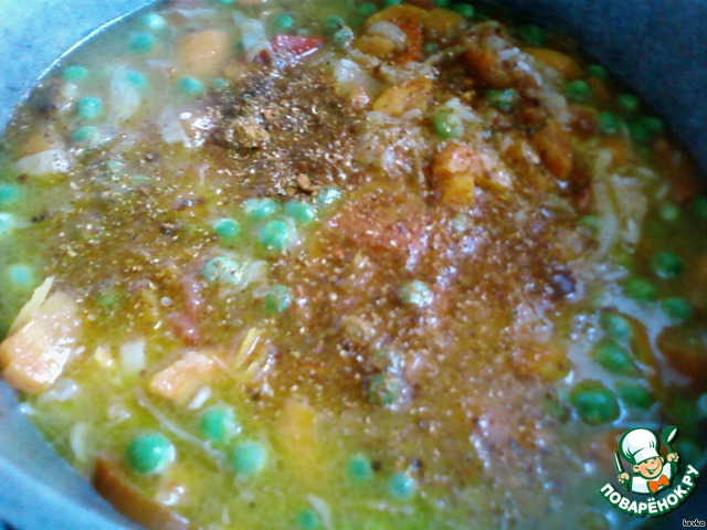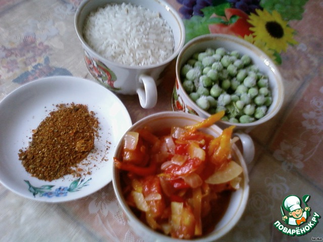 Рис промыть ("в семи водах"). Приготовит горошек, овощное ассорти (это у меня просто такой овощной салат, который очень гармонично пришелся к этому блюду). Я думаю его можно заменить и мороженым ассорти, и просто свежими овощами (помидор + перец + лук + морковка). И, конечно, специи - для меня это почти основной продукт. У меня был набор специй (корейский) к мясу.