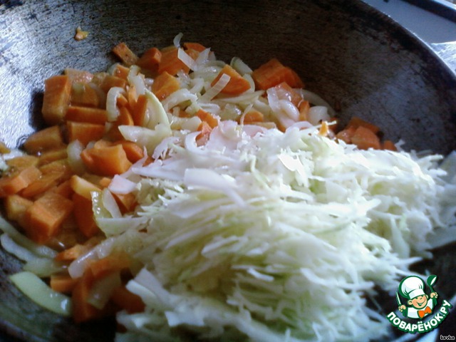 Лук почистить, крупно порубить и потушить на растительном масле (минут 5). Морковь почистить, порубить, добавить к луку и тушить дальше (еще минут 5). Капусту пошинковать (мелко) и добавить к луку и морковке. Все вместе тушить минут 5-10.