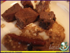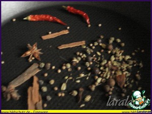 Готовим приправы - бадьян, кардамон, корица, чили, гвоздика, можжевеловые ягоды, перец горошком 3 видов - чёрный, белый и душистый, горчица горошком, корочка цитрусовых (в данном случае лимона или лайма), семена фенхеля, аниса, тмина, а ещё у меня были экзотичские семена - семена ангелики архангелики... Всё берём целиком (не измельчаем!) и понемногу, буквально один намёк каждой приправки. Приправки обжариваем на сухой сковородке до ароматного запаха - не думайте, что вы можете побежать к компу и зависнуть там... не-а, стоите над сковородкой, мешаете и ловите тот момент, когда приправы запахнут... Вот теперь их к мясу! Посолить по вкусу! Помешать и...