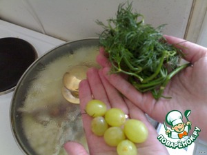 Минут за 5 до окончания готовки добавить виноград и измельченную зелень.