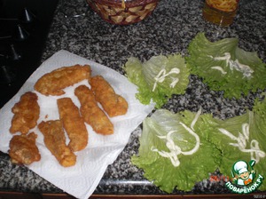 • Грудку из одной курицы порезать брусочками где-то 2 на 6 см, посолить, поперчить, обвалять в муке, потом в яйцах, в сухарях и обжарить в большом количестве растительного масла около 10 минут. Выложить на бумагу, чтобы стёк лишний жир и немного наши палочки остыли. На вымытые листья салата положить немного майонеза, потом куриные палочки, свернуть рулетиками и сразу подавать к столу. Очень приятное сочетание холодного листика, майонеза и тёплого мяса.