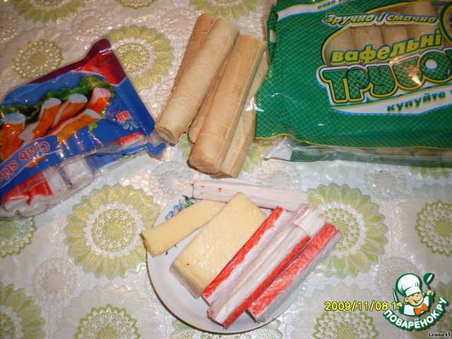 В вафельные трубочки вкладываем половинку (разрезанную вдоль) крабовой палочки и полоску сыра. Хорошенько обмакиваем в яичной смеси и обжариваем на растительном масле. |