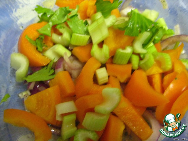 Сельдерей и перец нарезаем небольшими кусочками и кладем поверх лука.