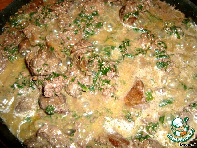 Обжарить кусочки печени на сливочном масле. Огонь должен быть сильным, чтобы лишняя жидкость выпарилась. Обжариваем 10-15 минут.