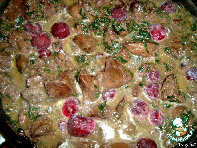 Ярко и очень вкусно! Может быть, это не совсем и салат, но вишня делает вкус настолько свежим и ярким, что назвать это блюдо просто "Печень в соусе" - как-то скучно.
