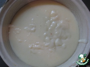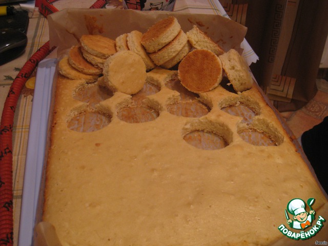 • Взбиваем яйца с сахаром, добавляем муку и потаявшее масло. Все хорошенько взбиваем, обмазываем протвень маслом и выливаем на него тесто. Отправляем в духовку (180 гр) минут на 20.