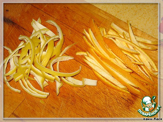 Цедру лимона и апельсина снимаем, режем полосками (этот апельсин съедаем)