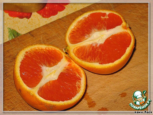Красный апельсин режем пополам, потом на дольки. Вместе со шкуркой.