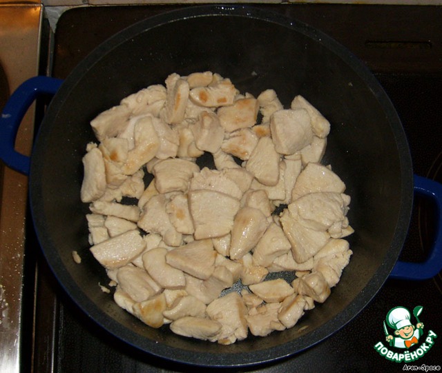 Нагрейте в глубокой сковороде или эмалированной кастрюле четыре столовые ложки растительного масла. Поместите в разогретое масло кусочки курицы и жарьте при постоянном помешивании на БОЛЬШОМ огне около пяти минут до появления румяных коричневых пятнышек. Снимите с огня и отставьте на время в сторонку.