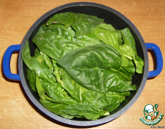 Итак, нам понадобится парочка здоревенненьких пучков свежего шпината. Переберите его, удалив подпортившиеся листочки и уложите в глубокую кастрюлю.
