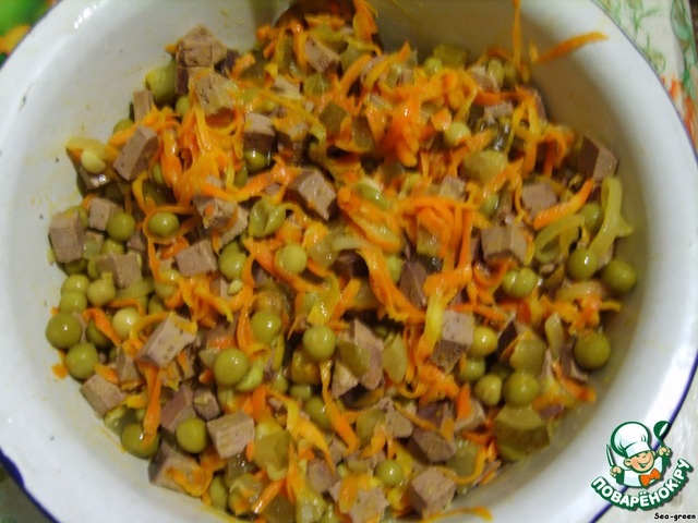 Вкусный салат из печени, горошка, соленого огурца, моркови и лука. Попробуйте и вам понравится.