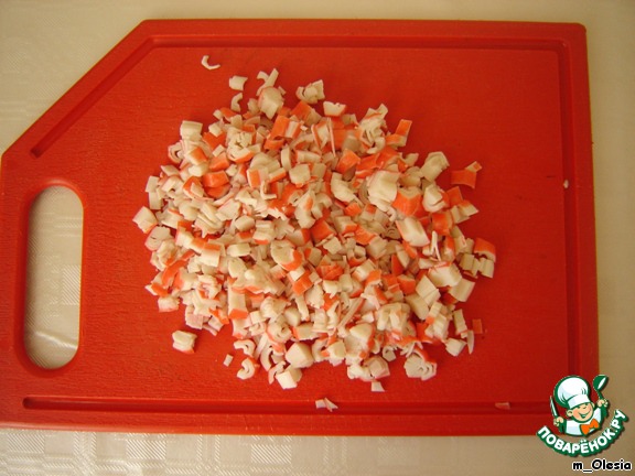• Берем 200 г форели, 200 г крабовых палочек, плавленный сыр, зеленый лук, майонез.