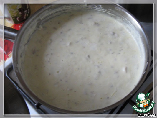 Шампиньон рубим очень мелко, почти в фарш, обжариваем, добавляем 1 ч. л. муки, перемешиваем, заливаем стаканом сливок. Добавляем приправу "Белые грибы".