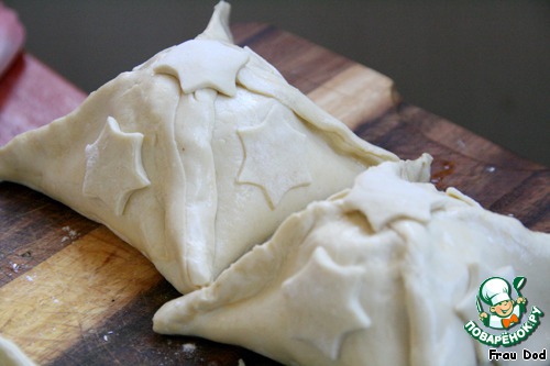 Положить фаршированные яблоки на квадраты теста, смазать края теста слегка взбитым яйцом, склеить и крепко защипнуть. Вырезать из теста небольшие кружочки (у меня получились звездочки), наклеить на место соединения наверху яблок. Меня поперло - налепила звездочек еще и на боковые части.