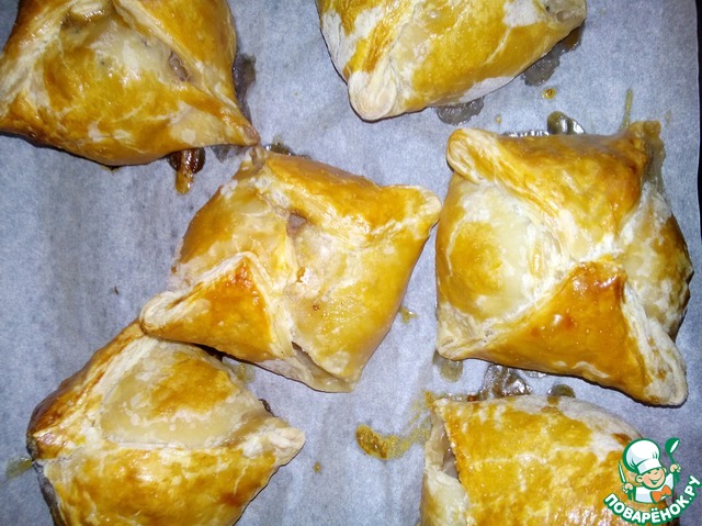 Смазать слойки яйцом, поставить в разогретую до 180 градусов духовку на 20 минут - пока не подрумянится. Приятного аппетита!