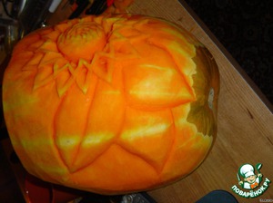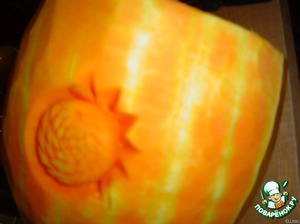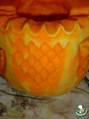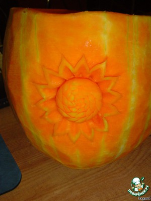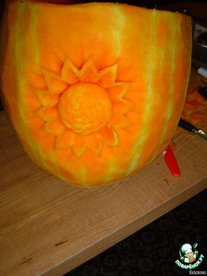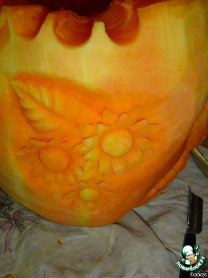 Края вазы должны быть красивыми. Для того, чтобы это сделать, мы на равном расстоянии друг от друга делаем выемки полукруглым карбовочным ножом по всей окружности тыквы. А затем убираем мякоть из-под образовавшихся полукругов. В итоге - красивый край вазы. По обеим сторонам центрального цветка я вырезала несколько мелких цветов с листьями.