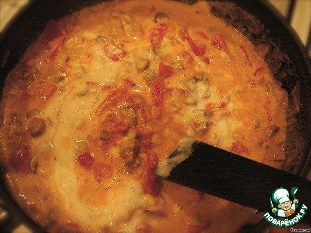 Затем поджариваем в небольшом количестве растительного масла до испарения большей части жидкости.