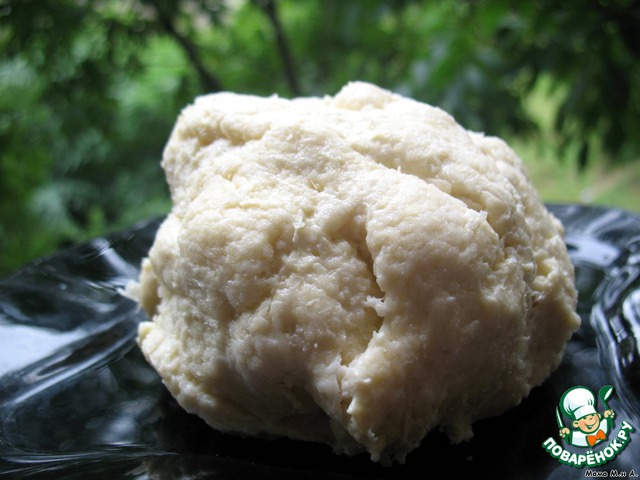 Смешать муку, картофельные хлопья и разрыхлитель.. Положить нарезанное кубиками холодное масло. Смешать блендером в крошку, добавить воду и быстро перемешать. Поставить в холодильник и охладить тесто не менее получаса.