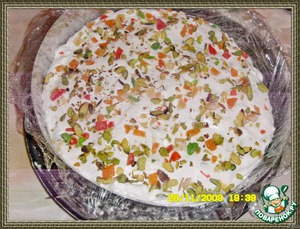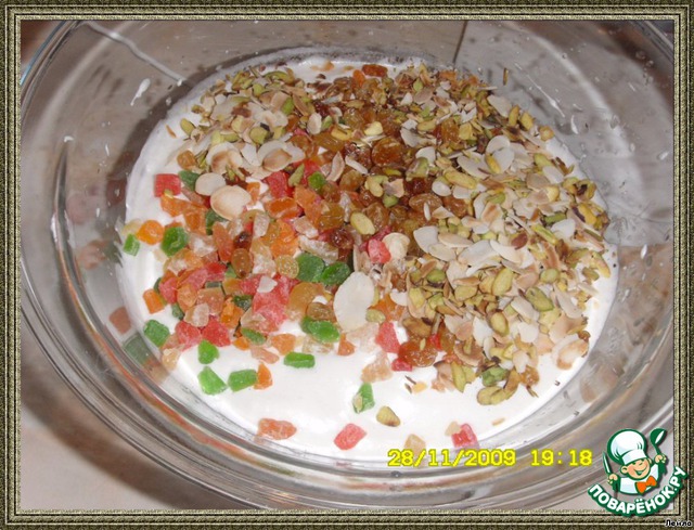 Заранее мелко нарезать фрукты, цукаты и орехи.