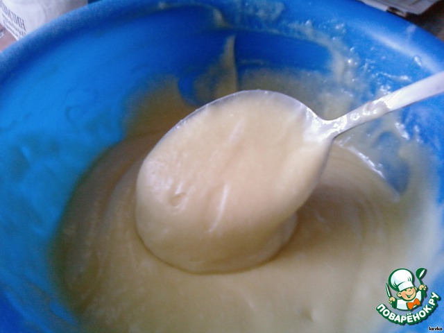 Яйца взбить с сахаром, добавить растопленый маргарин и майонез. Добавить гашеную соду. Муку и крaхмал просеять и замесить тесто. Вот такое красивое и ароматное тесто у меня получилось. Я еще добавила ванилинчик.