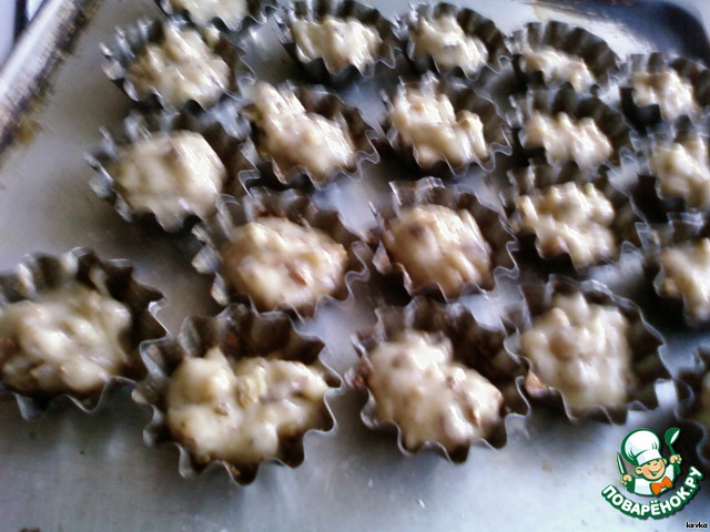 Пока у меня подсушивались в духовочке орехи (грецкие) я, чтобы не терять времени, решила сделать порцию с шоколадом. Но так как получилось оооочень вкусно, то сделала две порции (порция - 20 шт - по наличию формочек). Для этого я подготовила формочки - смазала растительным маслом и припорошила мукой - и разложила в них тесто. Сверху положила по кусочку шоколада и немножко его "притопила".