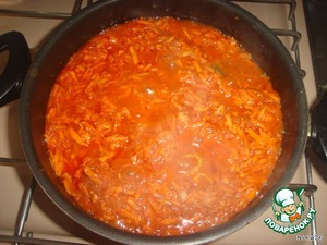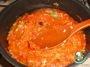 Мелко нашинковать лук. Добавить томатную пасту, разведенную водой до консистенции густой сметаны (1 стакан). Туда же добавить 1 стакан растительного масла, 5 лавровых листьев, соль, перец и тушить до тех пор, пока лук не станет мягким и масло не окрасится в красный цвет.
