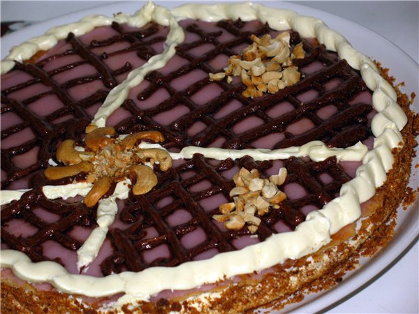 Рисуем сеточку, украшаем оставшимся кремом и орешками. -