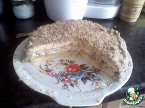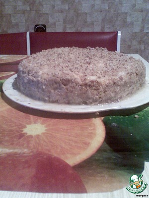 Теперь складываем торт. Берем бисквитный корж и выкладываем яблоки. Сверху смазываем кремом и укладываем безе. Затем снова смазываем кремом, кладем второй бисквит. Оставшимся кремом смазываем весь торт и посыпаем орехами.