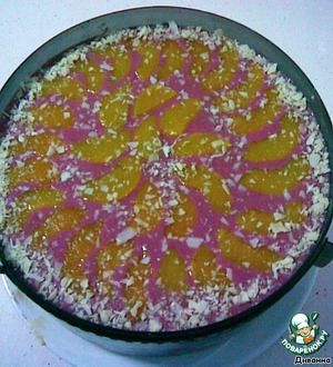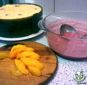Потом вылить оставшийся вишневый крем. Выложить дольки персика. И опять в холодильник.