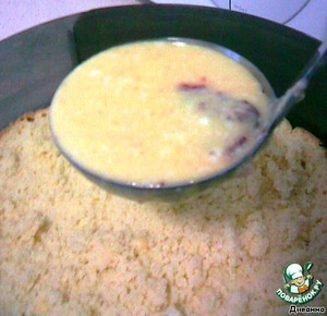 Наливаем наш персиковый крем. Он должен закрыть корж полностью.